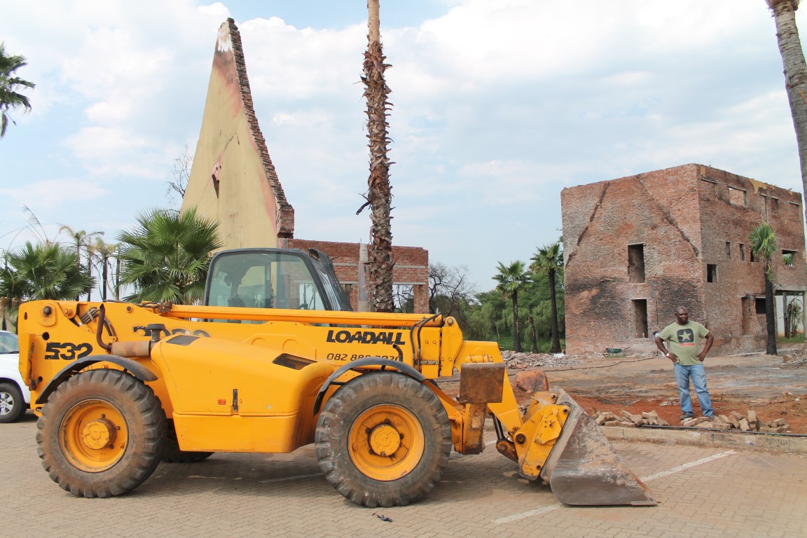 Die meeste van die puin is reeds opgeruim, maar afgebrande strukture is steeds sigbaar.