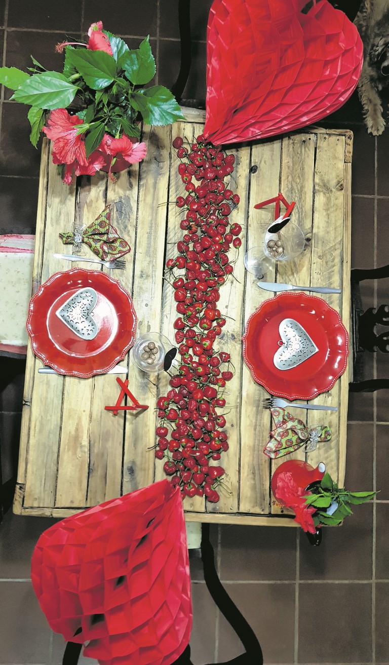 Vir die tweede tafel het ons met rooi borde gedek en sommer rooi hibiskusblomme uit die tuin gebruik. Die “tafelloper” is van pikantrissies gemaak, maar aarbeie sal uitstekend werk en kan sommer van die tafel af geëet word.
