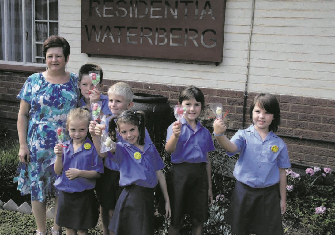 Hulle lyfies is dalk nog klein, maar hulle harte is groot. Die gr. 1-leerders aan die Waterbergskool vir Christelik Volkseie Onderwys (CVO) op Modimolle het op Vrydag 22 Februarie die Residentia Waterberg-ouetehuis besoek en hand-gemaakte sjokolades vir die bejaarde inwoners uitgedeel. Van die inwoners was gelukkig genoeg dat die jonges vir hulle ’n paar liedjies gesing het. Voor is Liani de Beer en Juanel Visagie. Agter staan Elana Harris, Kian Abrie, Koos van der Merwe, Elmé van Deventer en Jessica Hooneberg.