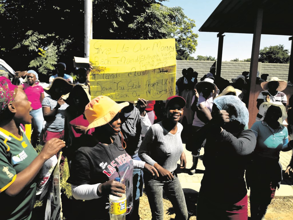 Van die dansende betogers se plakkate het gelees: “Give us our money back Mandi (Stilhoek has lost a lot because of you!”), “Mandi must fall down, you stole from us!” en “Bring our money back Mandi!”