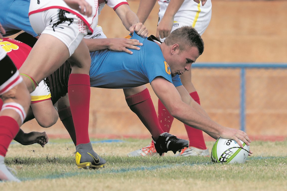 Die jaarlikse Hansie-rugbyweek by Hoërskool Hans Strijdom in Mookgophong het weer dié vakansie vir kookwater-skolerugy gesorg. Alex Wessels van Hoërskool Hans Strijdom veg hier verbete om besit van die bal. Dié kranige eerstespanspeler het gewys dat die Hansies ’n wenspan is. Hul eindtelling teen Hoërskool Morgenson was 41-0. Foto: Herman Steyn