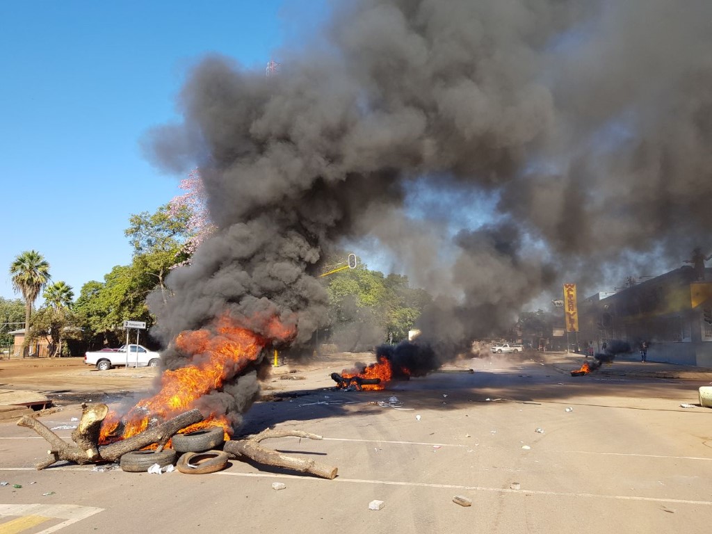 Ooggetuies op die toneel beweer dat ’n bakkie sonder nommerplate die buitebande wat aan die brand gesteek word, aanry.