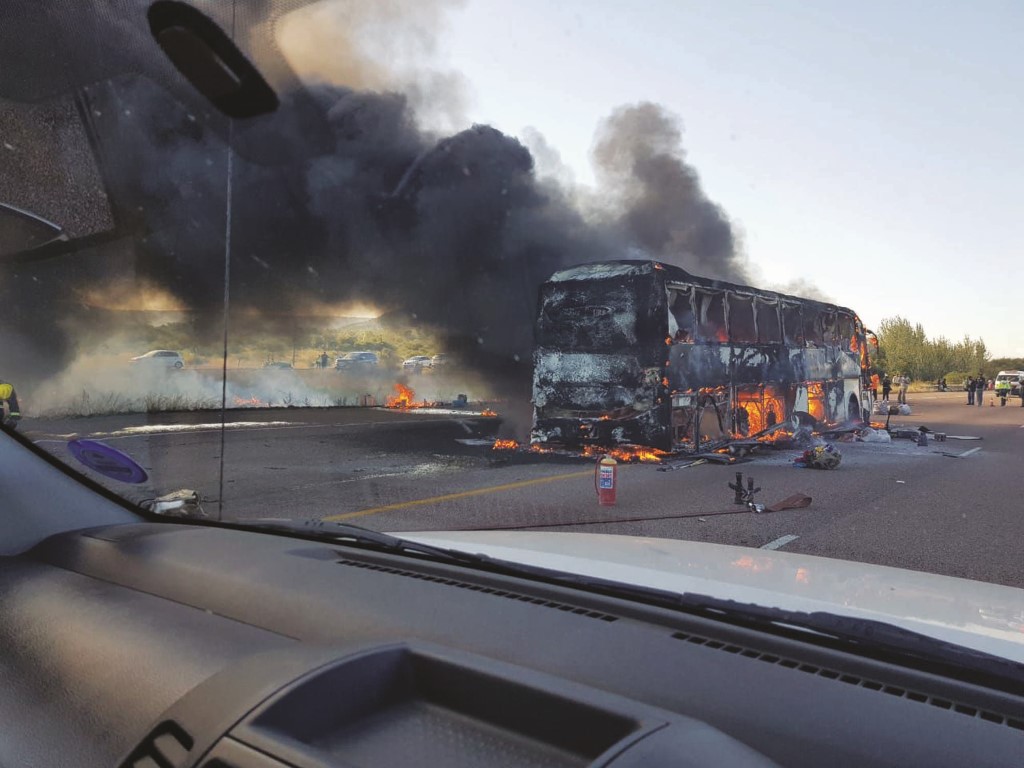 ’n Bus het op Maandag 4 Junie naby die Middelfontein-afrit op die N1-snelweg tussen Modimolle en Mookgophong aan die brand geraak. Kol. Moatshe Ngoepe, provinsiale polisiewoordvoerder, het gesê die busbestuurder het besef dat die bus begin brand het en dadelik stilgehou sodat die passasiers met hul bagasie betyds uit die bus kon kom. Niemand is tydens die brand beseer nie, het hy gesê. Volgens Ngoepe het die bus glo aan die brand geraak weens ’n tegniese probleem. Foto: Verskaf