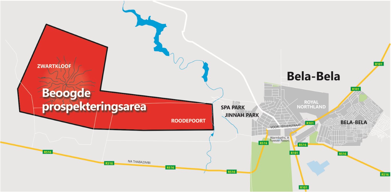 Luidens ’n kennisgewing van die maatskappy is die grond waarop hulle wil prospekteer op Zwartkloof 707 KR gedeeltes 0, 1, 9, 10, 11, 12, 20 en 126.