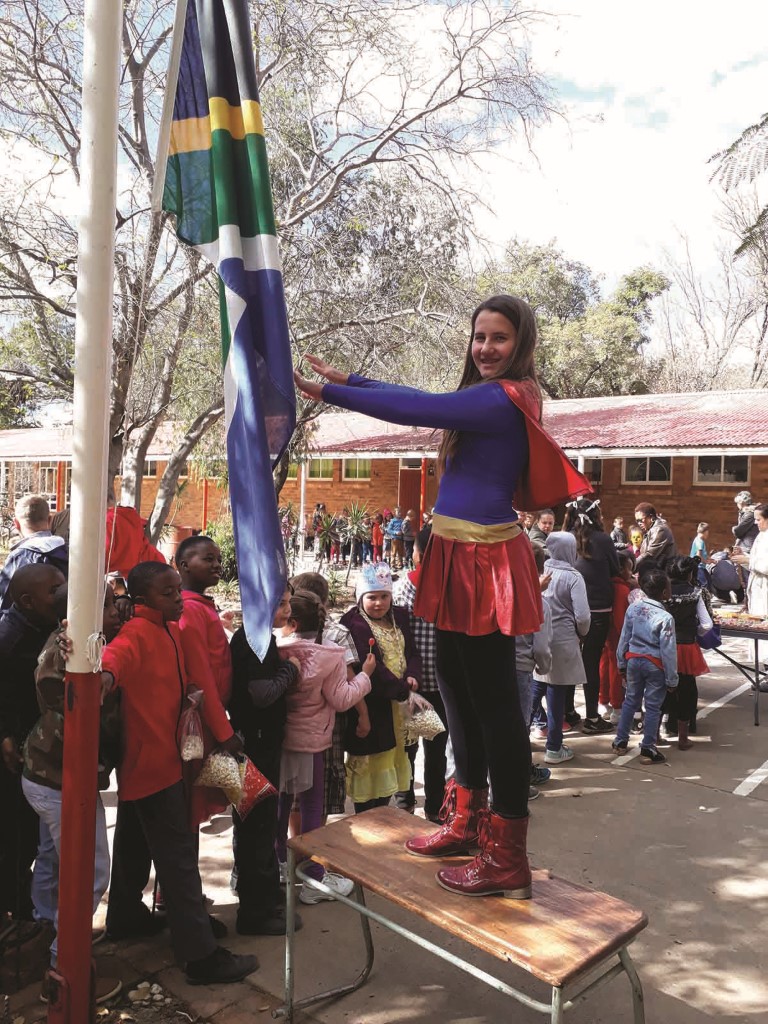 Leani du Toit, Laerskool Vaalwater se hoofmeisie, het haar uitgeleef in die gr. 7-tema op Woensdag 18 Julie toe Mandeladag gevier is. Hier is sy as ’n “supervrou” wat die vlag sonder die hulp van die tou moes hys. Die Valies het genoeg suiker vir die dag ingekry nadat die gr. 7-leerders vir elke klas koek gebring het.