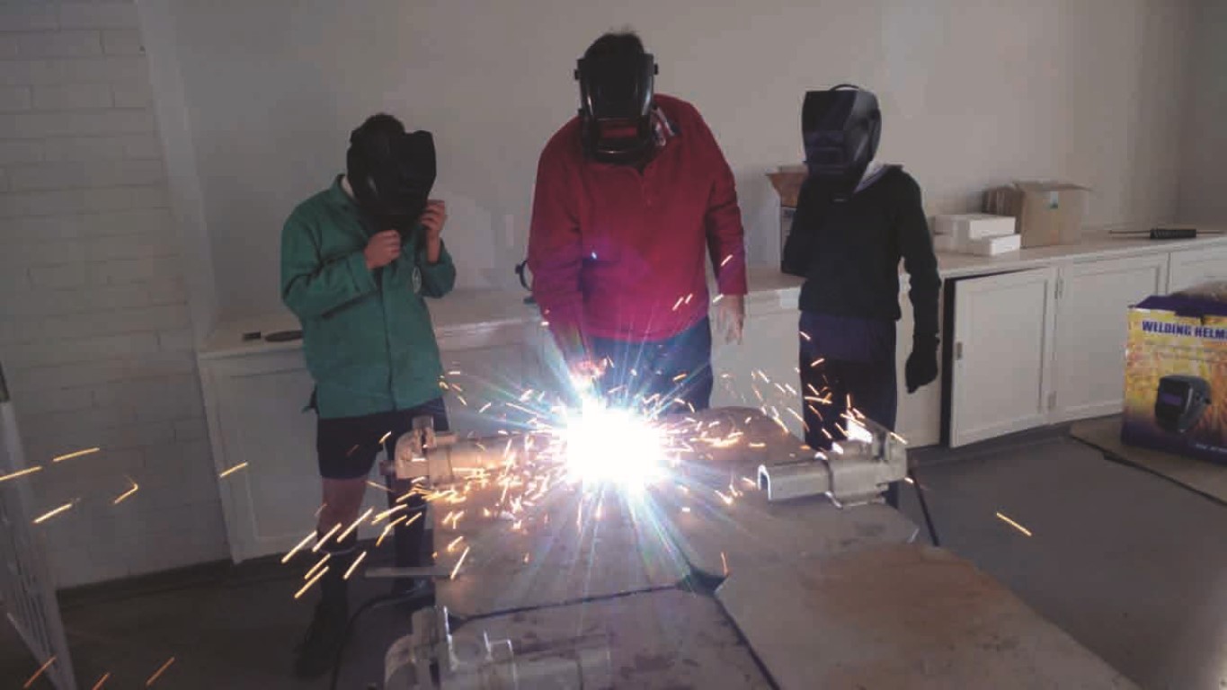 Die skool bied ook nou tegniese vakrigtings aan. Twee gr. 10 siviele tegnologie-leerders, Deon van Tonder en Bafana Mabusela, help hier hul onderwyser, Pieto Fourie, om die laaste werkbanke en gereedskapkaste reg te kry. Die elektriese klasse het ook aandag gekry en spog nou met splinternuwe, moderne toerusting.