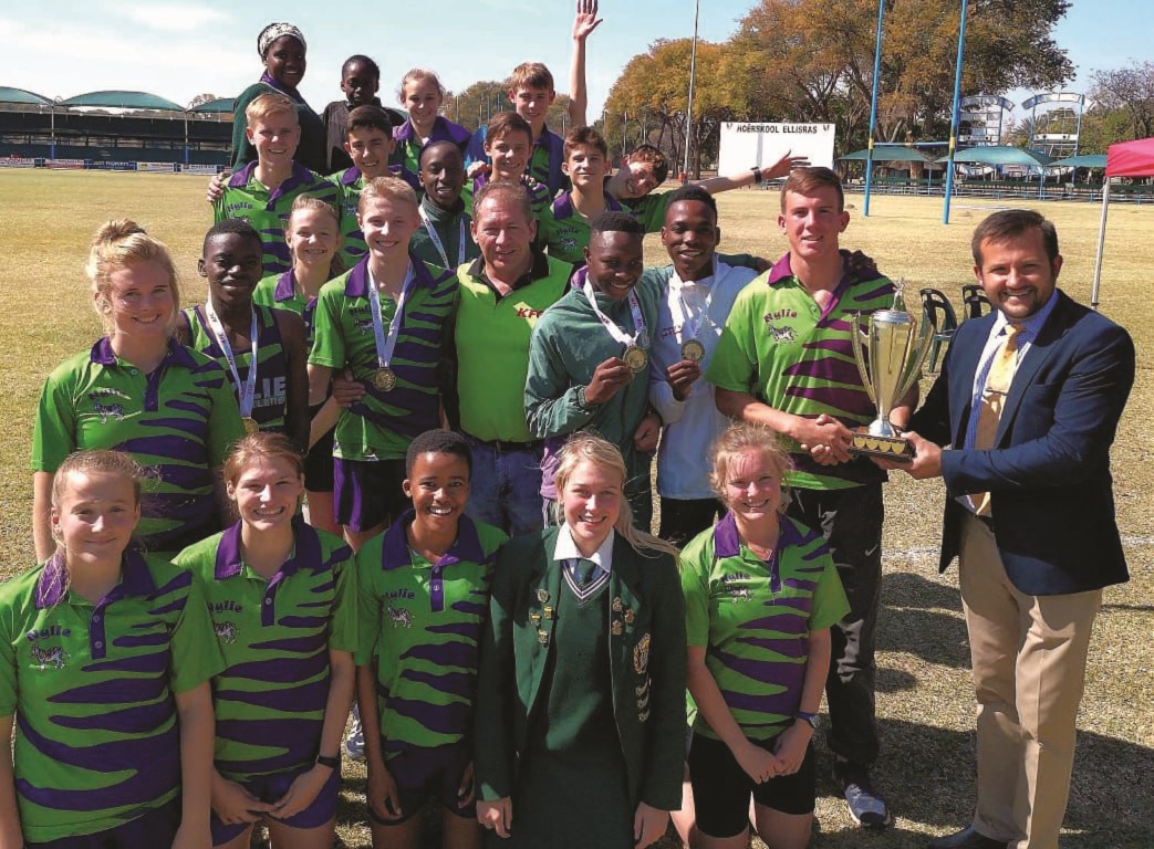 Die landloopatlete van Hoërskool Nylstroom het vir die tweede jaar in ’n ry stof in hul teenstanders se oë geskop tydens die interhoër wat op Dinsdag 31 Julie by Hoërskool Ellisras gehou is. Die senior- en juniorseunspanne het algeheel eerste plekke behaal. By die atlete is Martin Jansen van Vuuren, hul afrigter, en Adriaan Joubert, die hoof van Hoërskool Ellisras, wat die trofee oorhandig.