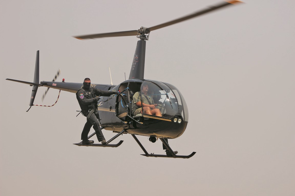 Die helikopter en skerpskutters, wat aan die buitekant van die helikopter op die voetstukke gestaan het, het ingevlieg gekom. Hoërisiko-demonstrasies is gelewer deur eers ’n kaping en daarna ’n stropingdemonstrasie voor te stel.