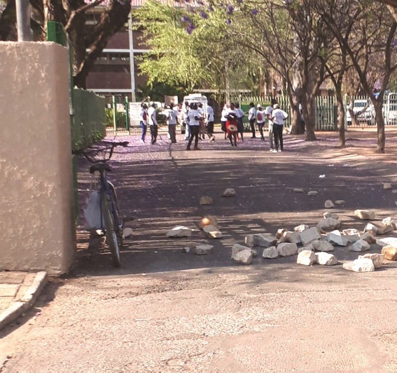 Die betogers het tydens die betoging klippe voor die skoolhekke gepak, maar nadat die polisie opgedaag het, is die klippe verwyder. Die werkers word deur die nasionale onderwys-, gesondheids- en verwante werkersunie (Nehawu) verteenwoordig.
