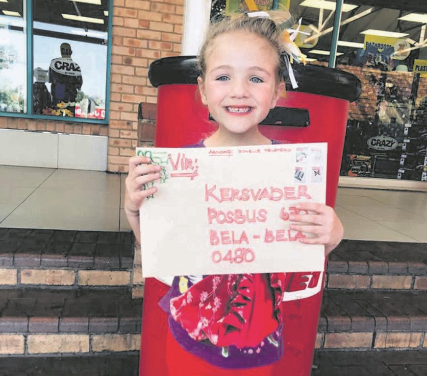 Klein Annabelle Streicher (6) van Heidelberg het verneem die poskantoordienste is vanjaar stadig. Sy het besluit om haar wenslysie via Die Pos na Kersvader te stuur. Gelukkig kan Oupa Fellies en Ouma Ronelle Felstead van Bela-Bela ook nou insae hê in hierdie versugting. Sy was immers heeljaar stroopsoet!