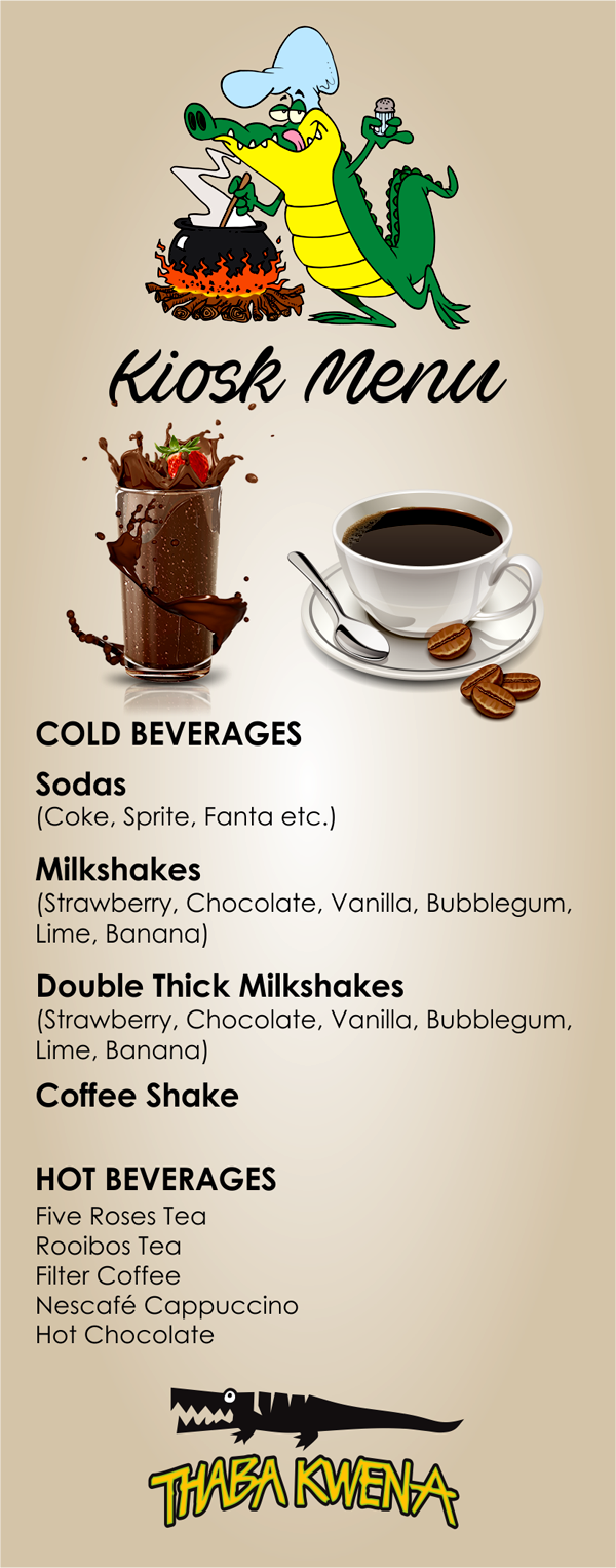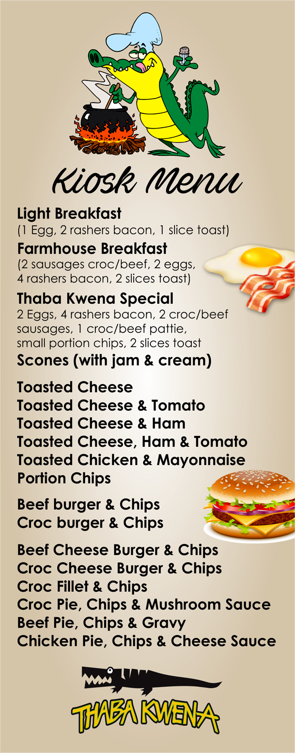 Why not sit down and enjoy a Croc Burger or even a Croc Pie? For the not so brave… We offer a variety of other mouth watering light meals (see our menu’s)